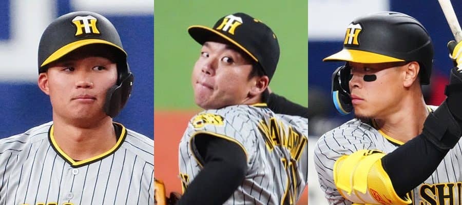 阪神・森下翔太、村上頌樹、佐藤輝明(左から)【写真:荒川祐史】