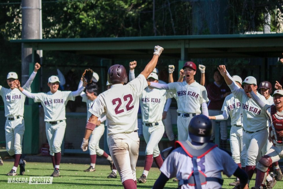 慶大2回戦でサヨナラ本塁打を放った久保嶋(背番号22)と早大ベンチ