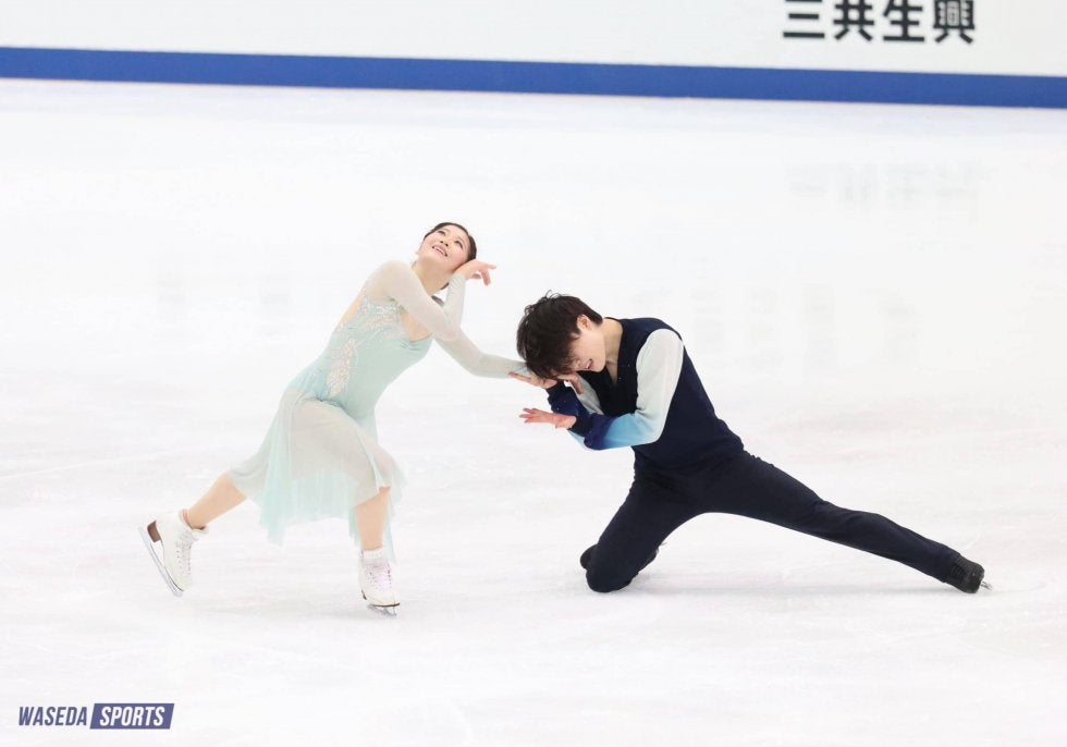 北京五輪代表の小松原美里・尊組(倉敷FSC)や、10月の予選会で優勝した吉田唄菜・森田真沙也組(木下アカデミー)をRDで上回り、期待や注目度が高まった中迎えたFDの演技。先に演技を終えた2組の好演でボルテージの上がった会場に、ポップなRDとは印象がガラリと違うクラシック音楽が流れて演技が始まると、まず、バレエのリフトのように腰を持って女性を持ち上げる形が多用されたコレオアシストジャンプでプログラムの世界観が提示される。続くスピード感を持った滑らかなスライディングムーブメントも含め、プログラム冒頭のコレオエレメンツでは、過去の大会よりも高い出来栄えの評価を得た。