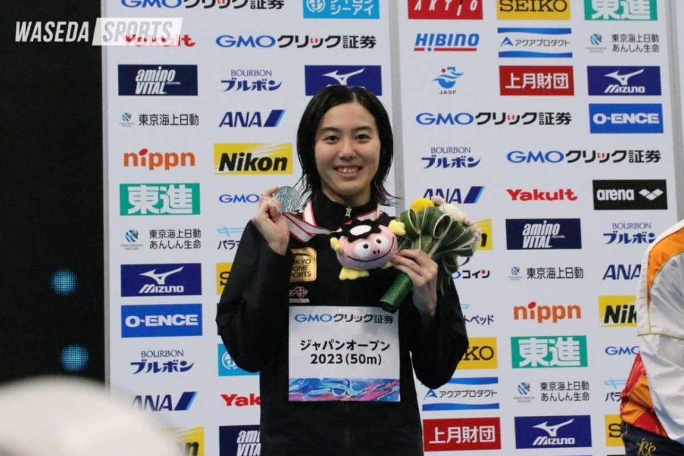 松本が50メートル自由形で、今大会早大勢唯一のメダルを獲得した。予選3組に出場した松本は、15メートルの規定ラインぎりぎりまで潜水を続け浮き上がりでは先頭に。その後も後続の選手との差を広げていき25秒87で1番にタッチした。全体では3位につけて決勝進出を決めた。日本学生選手権で2位にも入ったこの種目。決勝ではスタートでわずかに前に出て、25メートル付近までトップで泳いでいく。その後4レーンの山本茉由佳(ルネサンス)にかわされるが、ずるずると落ちることはなくそのまま2着。これが今大会早大勢唯一のメダルとなった。