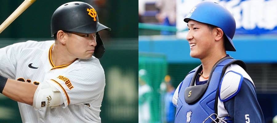 巨人・萩尾匡也(左)とDeNA・松尾汐恩【写真:矢口亨、荒川祐史】