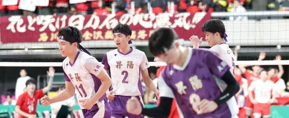男子1回戦 昇陽(大阪)対土浦日大(茨城) 第2セット、得点し喜ぶ昇陽の選手ら=4日、東京体育館(酒井真大撮影)