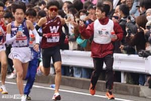 すぐ後ろで明治の選手がスタートしてくる状況で、かつ明治の綾君(一輝)も一年生とはいえ力のある選手のため、追い付かれて後ろにつかれるだろうとは考えていました。そこで一旦後ろに下がるという選択肢もあったのですが、シード権の安全圏にチームを戻すことと6区・7区と流れが悪い中でチームを立て直すことを考えた時、自分が後ろに下がって牽制し合ってペースが遅くなるのだけは避けたかったので、自分が利用されることは承知のうえでペースを作ろうと思っていました。帝京大が加わってからも考えは同じでした。