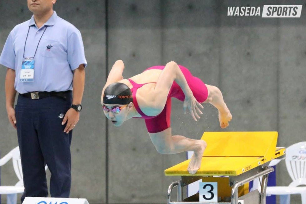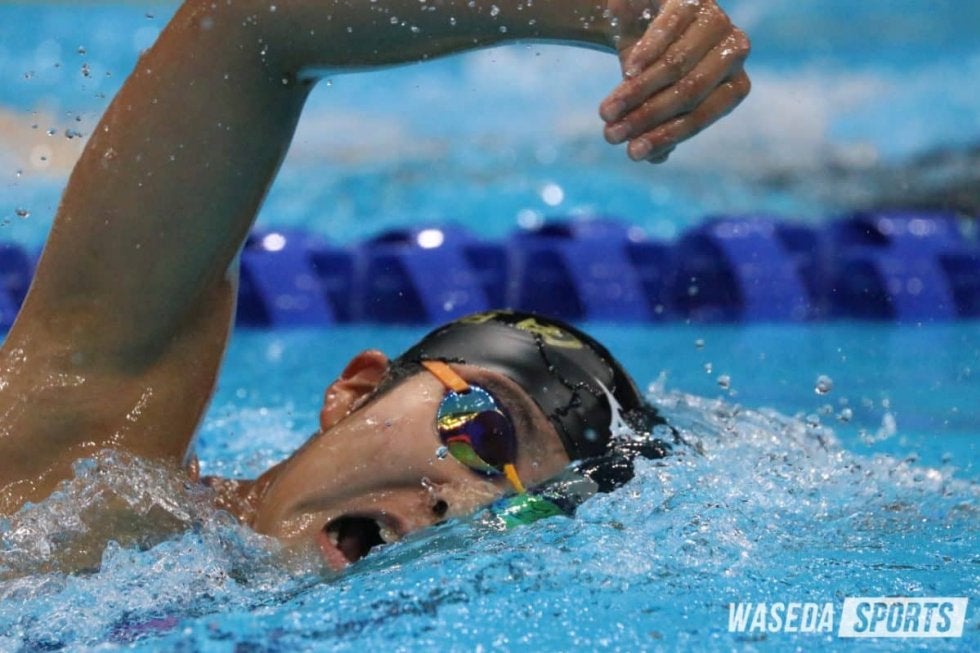 女子50メートル背泳ぎでは亀井涼子(スポ2=東京・淑徳巣鴨)が、今大会自身初の決勝の舞台に臨んだ。予選では5組の3レーンに入ってのスタート。浮き上がりでわずかに差を取るが、25メートル付近では3位争いに加わっていく。そこから大きく順位の変動はなくゴールし、組3位全体5位で予選を突破した。決勝では笑顔で入場してきた亀井。水面に浮上してから25メートル付近までは、ほとんど横並びでレースが進んでいく。残り15メートルをきったあたりから、じりじりと各選手の立ち位置が浮き彫りになっていき、亀井は全体の中で後方に位置していた。予選よりはタイムを上げたが、力及ばず7位で今大会の競技を終えた。新開誠也は得意の200メートルバタフライで決勝に進んだ。予選は4組の2レーンに登場。スタートからしっかり前方につけ、100メートルを2番手で折り返していく。しかし残り50メートルをきってから、後ろからの激しい追い上げで最後のタッチは組4番手。全体では8位に入り、2年連続の決勝進出を決めた。浮き上がりまでで頭一つほど差をつけられてのスタートとなる。7位で50メートルを折り返すと、そこから徐々に上げていき、100メートルを6位で通過した。後半になると一かきごとの推進力が少し落ちはじめ、150メートルの折り返しでは再び7位に。少しでも追い上げたいところだったが、前を行く選手たちとはかなり差が開いており、順位を上げることはできなかった。