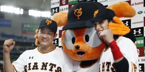 中日に勝利し、ポーズをとる巨人・菅野(左)と陽岱鋼=東京ドーム【写真提供:共同通信社】 読売巨人が8対2で中日に勝利。6…