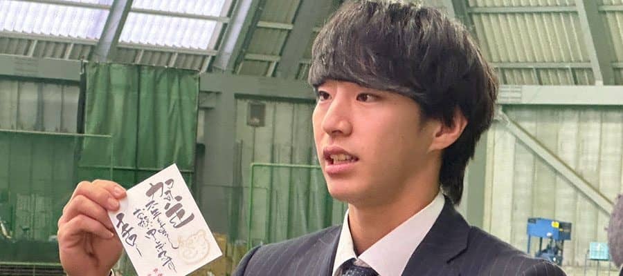 イチロー氏からもらった年賀状を持参したDeNA・度会隆輝【写真:宮脇広久】