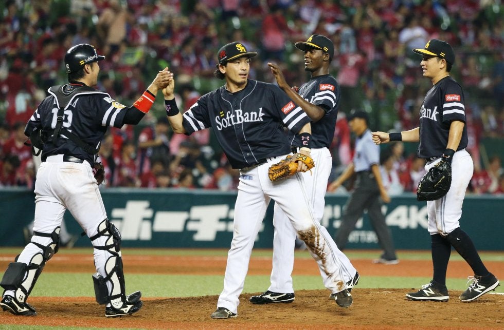 西武に競り勝ち、タッチして喜ぶ松田(左から2人目)らソフトバンクナイン=メットライフドーム【写真提供:共同通信社】