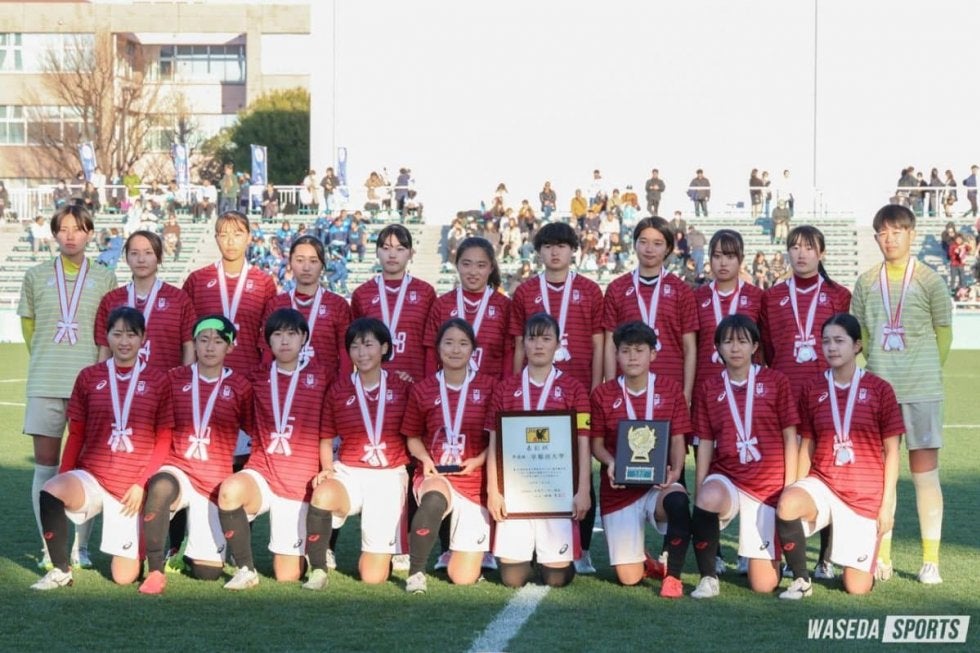 ア式蹴球部女子(ア女)は6日、2年ぶりに全日本大学女子選手権(インカレ)の決勝戦に臨んだ。7分にFW千葉梨々花(スポ1=東京・十文字)のゴールで幸先よく先制するが、18分に与えたPKのこぼれ球を決められ1-1に。39分にMF三谷和華奈副将(スポ4=東京・十文字)の豪快なゴールでリードし前半を終えたが、後半は主導権を握られる。85分にフリーキック(FK)を直接決められ延長戦に突入すると、95分にまたもFKからクリアボールを狙われ失点。シーソーゲームを制すことができず、悲願のインカレ優勝を目前で逃すこととなった。