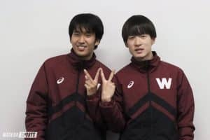 早実高からの後輩、石塚陽士(教3=東京・早実)とともに写真に収まる辻