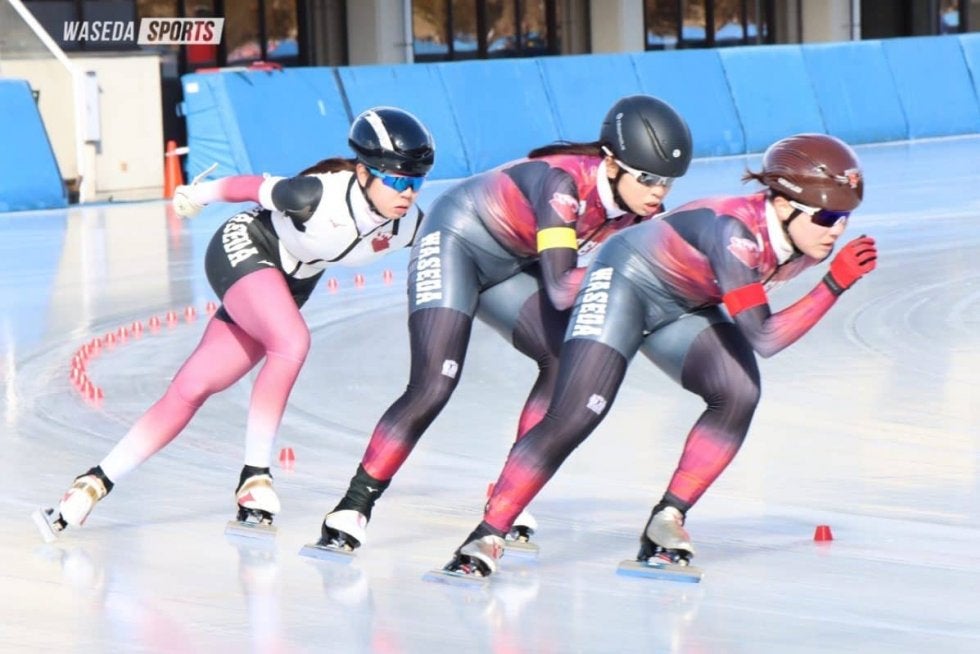 1月5~7日に高崎健康福祉大学伊香保リンクで行われた第96回日本学生氷上競技選手権(インカレ)。早大からは、清水凜(スポ3=福島・安積)、鈴木柊香主将(スポ3=北海道・帯広三条)、道見花恋(スポ1=北海道・帯広三条)の3名が出場した。清水は女子1000mと1500m、鈴木は女子1500mと3000m、道見は女子1000mと1500mに出場した。また、3人で早稲田大学として女子チームパシュートにも出場した。