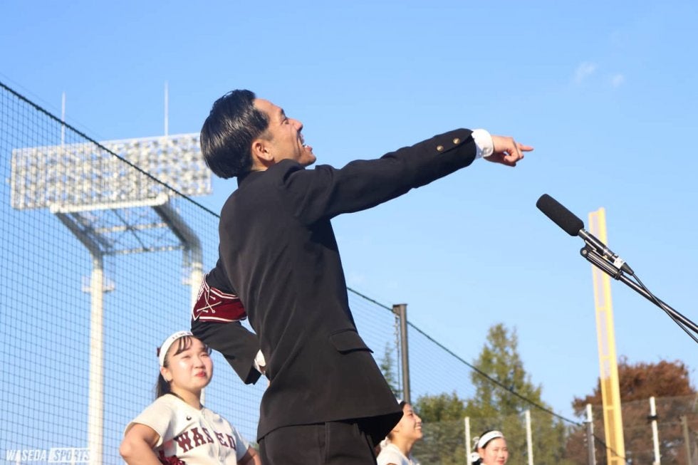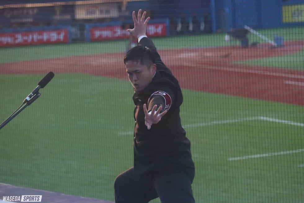 そして5回、試合が動き始める。応援企画責任者としても攻撃回のサイン出しで重要な役割を担う永井が学注で決死の思いを叫ぶ。そしてこの回先頭打者が内野安打で出塁すると、2死ながらチャンスを作り出す早大ナイン。『コンバットマーチ』が神宮に鳴り響き、打席の尾瀬雄大(スポ2=東京・帝京)の放った打球は左中間に、応援部の全員が笑顔になった。『紺碧の空』を全員で歌い上げ、応援席は歓喜の声であふれた。