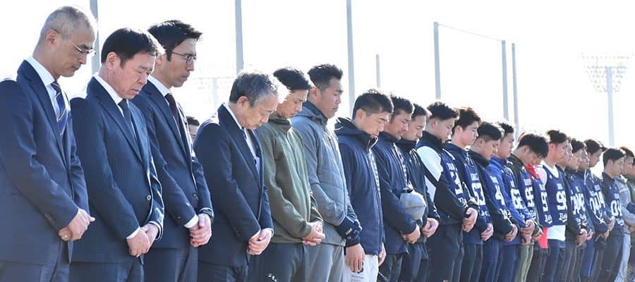 午前12時、グラウンドには湊通夫球団社長、福良淳一GM、コーチ陣ら新人合同自主トレに参加しているルーキーたちが出席した。今月1日には能登半島での地震もあり、田口コーチは「複雑な思い」と口にし「(震災の)トラウマが残っている、未だに消えていない」と、当時を振り返った。
