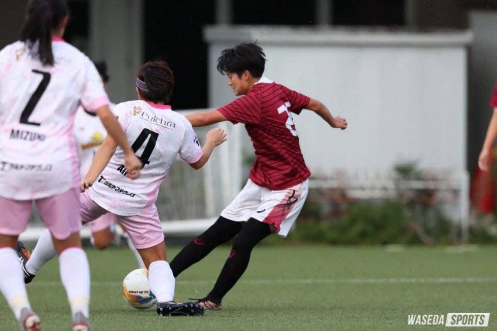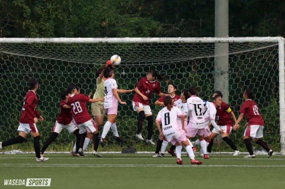 キックオフとほぼ時を同じくして、小雨が降り始めたこの日の東伏見サッカー場。開始1分に右サイドから攻め込まれ、丸山が弾いたところに打たれたシュートはポスト。リーグ2位につける強豪を相手に、不穏なスタートを切る。しかし、スコアを動かしたのはア女だった。11分、エリア内右側でボールを納めた千葉が、振り向きざまのシュートでキーパーの脇下を抜きゴール。先制に成功した。しかしその後は防戦一方の展開。23分には相手CKをニアで合わせられたが、落ちたところでDF杉山遥菜(スポ1=東京・十文字)がクリアした。35分には、中央左サイドで奪われたボールを中央まで運ばれるが、シュートは丸山が正面で抑えた。46分、MF新井みゆき(スポ1=埼玉・浦和レッズレディースユース)のドリブルから得たCKを、クリアされたところをDF藤田智里(スポ4=神奈川・大和)が拾いシュート。枠外に飛んだが反撃の姿勢を見せ続けるプレーになった。