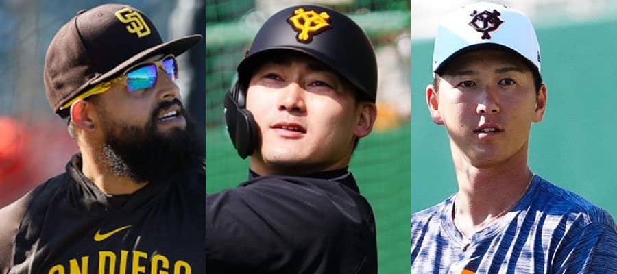 巨人のルーグネッド・オドーア、丸佳浩、秋広優人(左から)【写真:Getty Images、荒川祐史】