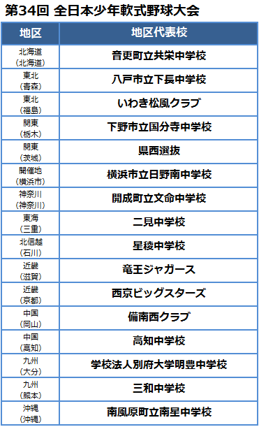 8月7日から開催された、第34回全日本少年軟式野球大会の出場校を掲載。