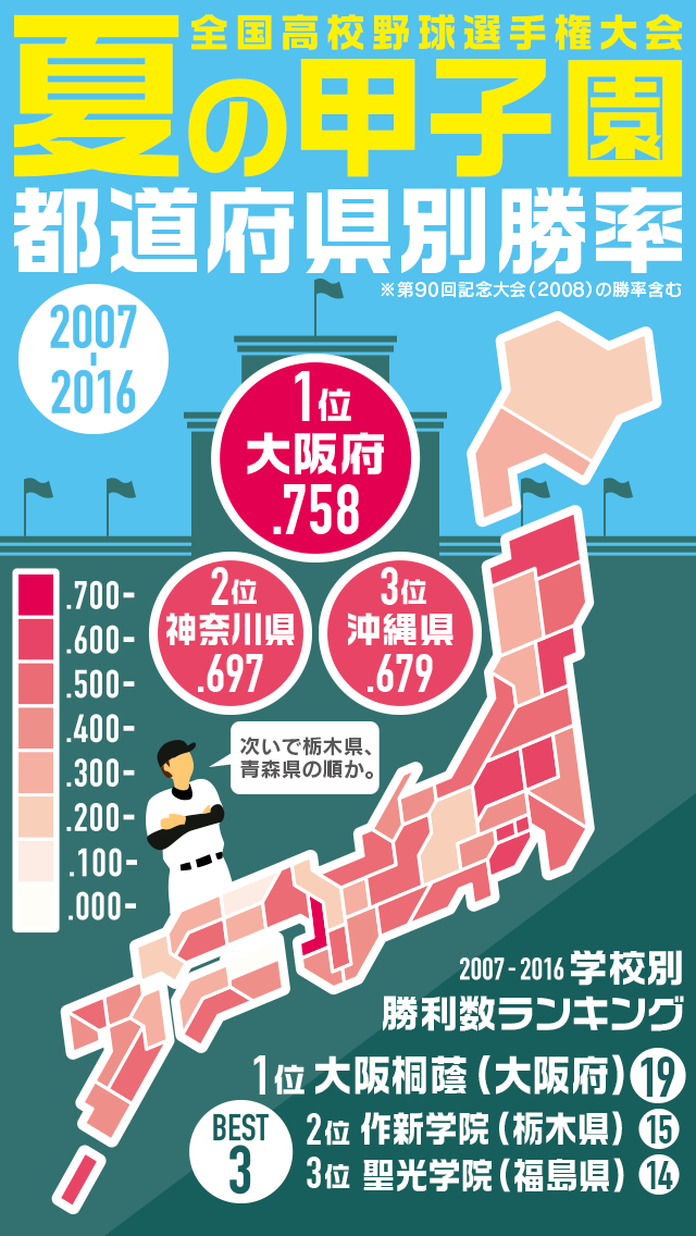 ■過去10年の都道府県別勝率 今年の夏も優勝候補筆頭に挙げられる大阪桐蔭。過去10年間で3度の夏の全国制覇を果た…
