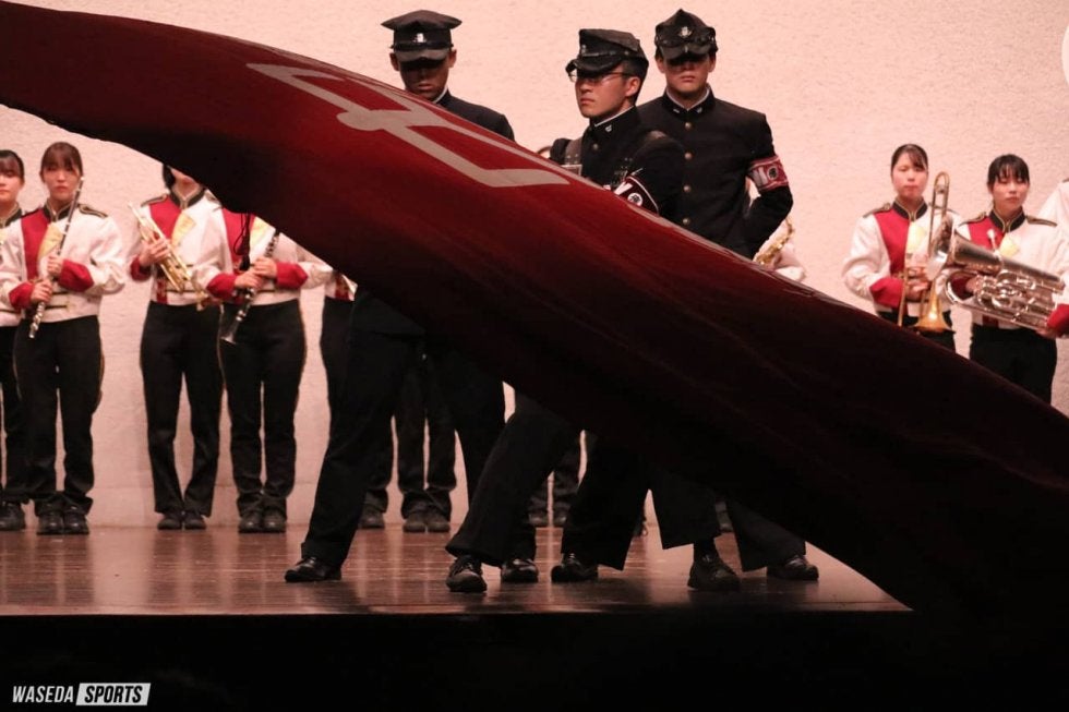 ステージの冒頭、司会のリーダー3年生によりセンターリーダー紹介や学注(学生注目)で入れる合いの手。そして、来場者に配布されたハリセンの使い方を説明して応援の楽しみ方を受験生に伝える。早稲田大学応援部が使用する「慶應倒せ」のコールに対し、慶應義塾大学も志望する生徒も一緒に盛り上がるよう受験生に呼びかけ、笑いを誘う場面もステージの冒頭で見られた。ステージは早稲田大学の校旗掲揚で幕を開けた。今回掲揚されたのは平成15年、早慶戦100周年を記念して作成された第二古茶旗。その翻す校旗の紅は8本の校旗の中で最も勇壮で最も迫力があるといわれる第二古茶旗が『早稲田の栄光』に合わせて、入場していく様子に多くの受験生が目を奪われた。旗手を務めた間垣皓介旗手兼新人監督(スポ4=宮城・仙台一)も「華の旗手」として、『昇り竜』と呼ばれる左右に大きく振りながらの校旗掲揚を豪快に披露する。