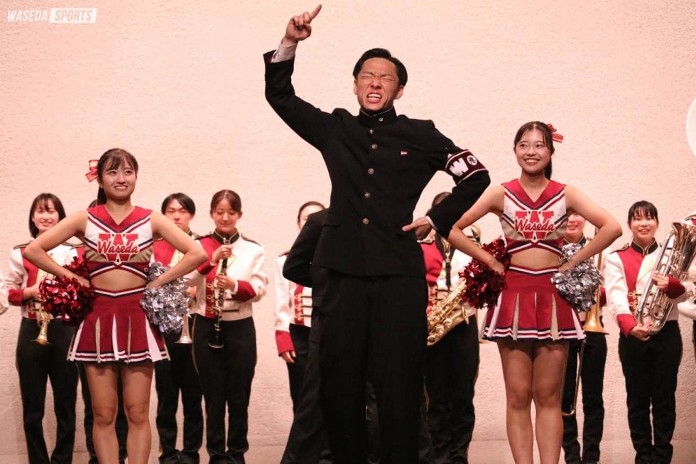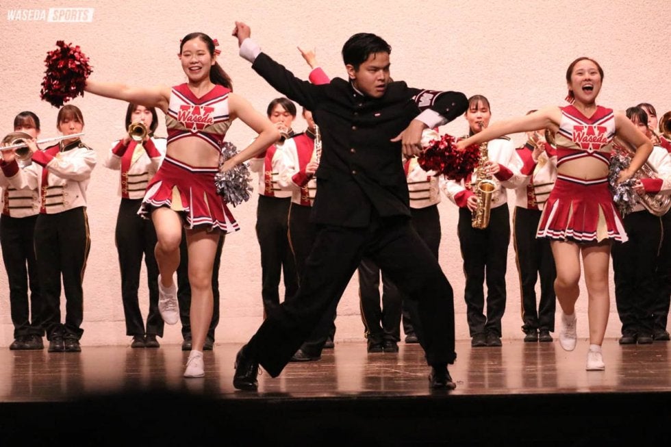 会場の興奮が冷めやらぬまま、応援曲メドレーを披露。丸尾隆三郎リーダー庶務(商4=広島・尾道北)がセンターリーダーを務め、メドレー中の学注では、自身の高校時代の思い出や、自信を持って受験に臨むことの重要性を受験生に熱い言葉で届ける。『大進撃』『スパークリングマーチ』『コンバットマーチ』をはじめとして、『ダイナマイトマーチ』や『SUNRISE』など日頃、体育各部の応援にて使用される数々の応援曲を惜しみなく披露。次々とリーダー4年生が舞台中央で堂々とテクを披露し、リーダー下級生による迫真の屛風拍手、吹奏楽団による迫力ある演奏、チアリーダーズのメリハリあるダンスで一体となって、早稲田の応援を作り上げる。受験生の合格を心から願う応援部のパフォーマンスに会場は熱気にあふれていた。「いいぞ、いいぞ受験生」の文字切りで締めくくると会場は万雷の拍手に包まれた。