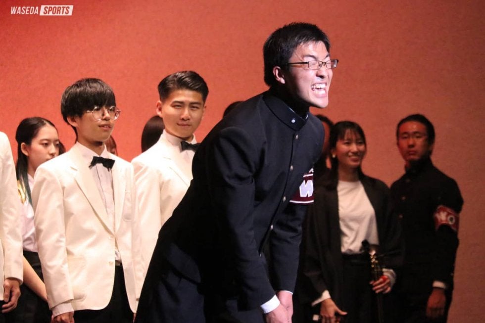 第三部では、野球部壮行会が行われた。野球部・熊田副将が「ともに慶應を倒し優勝の喜びを分かち合いましょう」と早慶戦への意気込みを語ると、永田新代表委員主将(教4=静岡・掛川西)から野球部にペナント、応援部からのメッセージが入ったユニフォーム、フォトモザイクアートを贈呈。「全早稲田と野球部が一体となった思いを早慶戦でよりいっそう近く感じられるように」と永田が熊田をはじめ野球部に熱い思いを込めて、贈呈が行われた。最後は永田を中心として、校歌を三番まで応援部、野球部、観客が愛校心のもと起立、脱帽の上腕を振り続けた。斉唱を終えると、大盛況のもと、第70回稲穂祭は幕を閉じた。