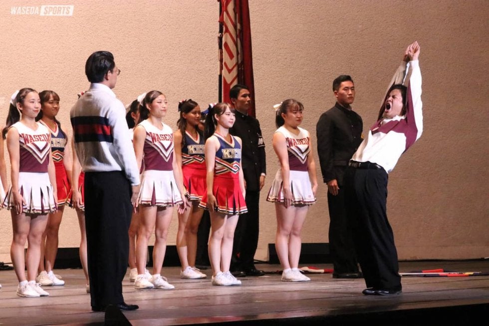 第二部では早稲田大学応援部と慶應義塾大学應援指導部による応援合戦が始まる。始めに、両校の校旗が舞台上へ入場。『早稲田の栄光』に合わせて舞台上に掲揚されたのは最も雄大で最も力強いといわれる新前川旗が堂々と入場をする。続いて、慶應義塾の塾旗が掲揚される。稲穂祭で入場した塾旗は最も秀麗で、最も鮮やかであるとされている慶應義塾新世旗だ。両校誇りの校旗が舞台上に所狭しと並ぶ様子に、講堂は荘厳な空気に包まれる。続いて両校の応援歌が交互に披露される。『若き血』『紺碧の空』『我ぞ覇者』『ひかる青雲』が披露されると、『早慶讃歌』が両校の応援部、指導部により披露される。丸尾隆三郎リーダー庶務(商4=広島・尾道北)と村井祐樹(4年)の「早稲田の友と、慶應の友と」から始まる口上で歌が始まると両校の部員が肩を組んで斉唱。互いに「華の早慶戦」の健闘を祈った。第二部も佳境を迎えると、「慶應義塾大学チャンスパターンメドレー」がスタート。メドレー中に壇上が真っ青になる演出も見られ、会場のボルテージが上がる。これに対抗するように披露されたのは「早稲田必勝応援曲メドレー」だ。壇上のスクリーンでは、『勝利の讃歌』と共に、リーダー4年生の下級生時代の様子と現在の様子が映像で回顧され、宮下陽三代表委員主務兼連盟常任委員(社4=長野・屋代)が学注へ。既にボルテージが最高潮に達している観客席からは、宮下が出てきた途端に歓喜の声を上げる観客も多く、魅せる準備は整っていた。「早稲田必勝応援曲メドレー」ではお馴染みの応援曲が、リーダー執行委員7名が次々と登場し、テクを振る。終盤では井原の稲穂祭と早慶戦に懸ける思いと覚悟が伝わる学注で、秋の涼しさを感じる講堂内は熱気に包まれる。最後にリーダー執行委員7名による『コンバットマーチ』の突きを見せ応援合戦を締めくくった。