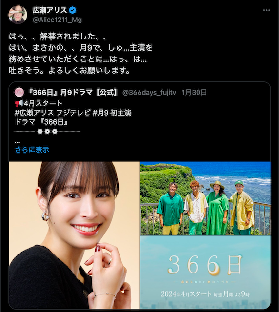 女優の広瀬アリスが30日、SNSを更新した。内容は4月から月曜9時に放送される新ドラマ『366日』の主演を務めるという内…