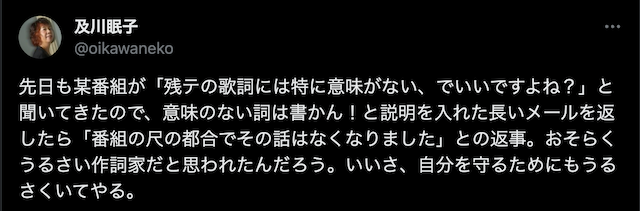 残酷な天使のテーゼを作詞した及川眠子がテレビ局に不満💢コメントでは「テレビ制作のふるーい慣行 もう終わらせたいですね」との声 | 話題の投稿