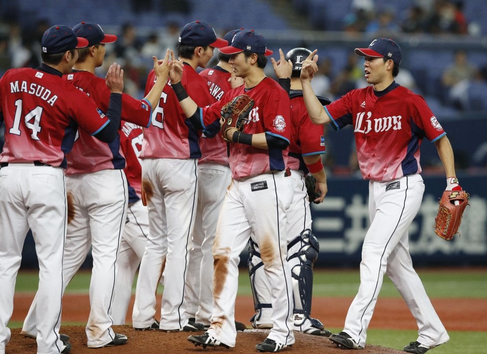 オリックスに勝利し、タッチを交わす秋山(右端)ら西武ナイン=京セラドーム【写真提供:共同通信社】