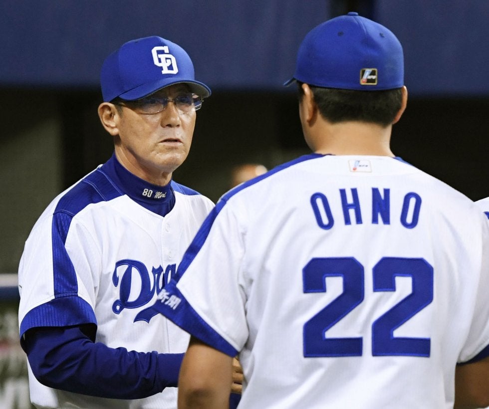 広島に快勝し、4勝目を挙げた大野を迎える中日の森監督=ナゴヤドーム【写真提供:共同通信社】中日が7対1で広島東洋を下し、…