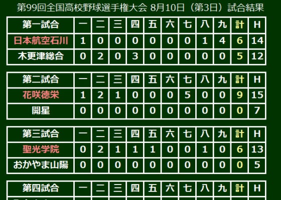 第99回全国高等学校野球選手権大会は10日、大会第3日が行われ、第3試合は戦後最長11年連続出場の聖光学院(福島)が、春夏通じて初出場のおかやま山陽(岡山)に6-0で快勝した。