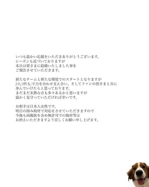 ドジャースの大谷翔平投手が29日、自身のインスタグラムを更新。結婚を報告した。「本日は皆さまに結婚いたしました事をご報告…