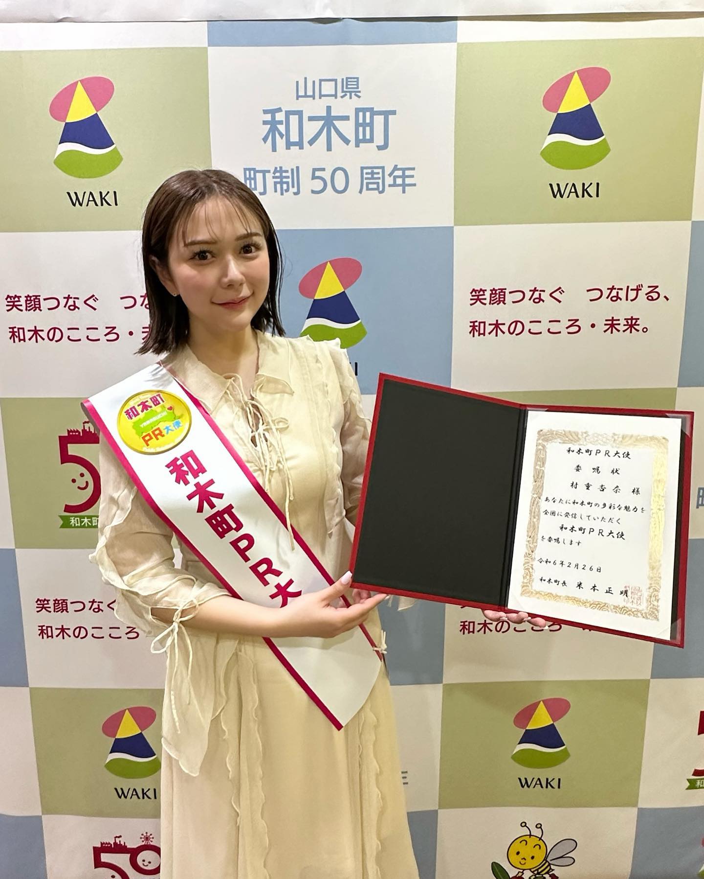 元HKT48メンバーでタレントの村重杏奈が27日、自身のインスタグラムを更新した。「この度和木町PR大使に就任致しました…