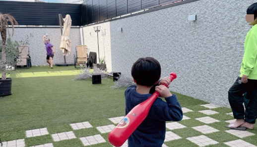 写真では子供たちがシャボン玉や野球をして遊ぶ姿を公開。充実した1日になったようだ。