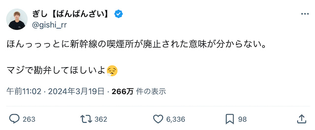 男女3人組YouTuber「ばんばんざい」のメンバー・ぎしが自身のXを更新した。「ほんっっっとに新幹線の喫煙所が廃止され…