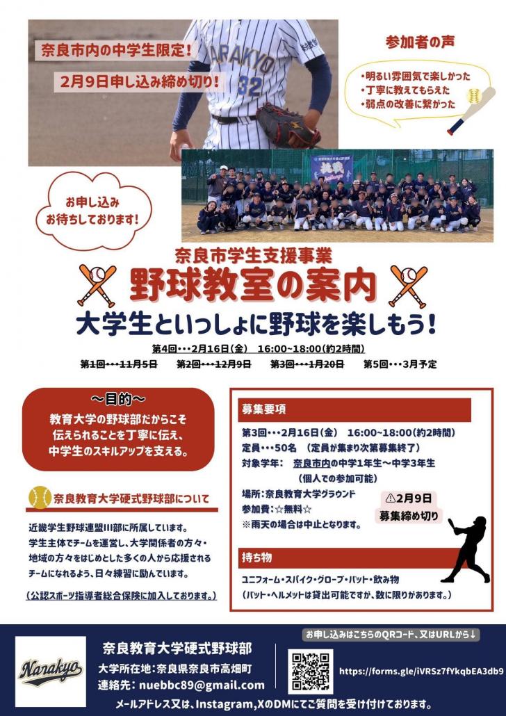 今年、奈良教育大学硬式野球部は奈良市の支援(奈良市地域に飛び出す学生支援事業)を受けて、中学生向けの野球教室を全5回の日程で行った。