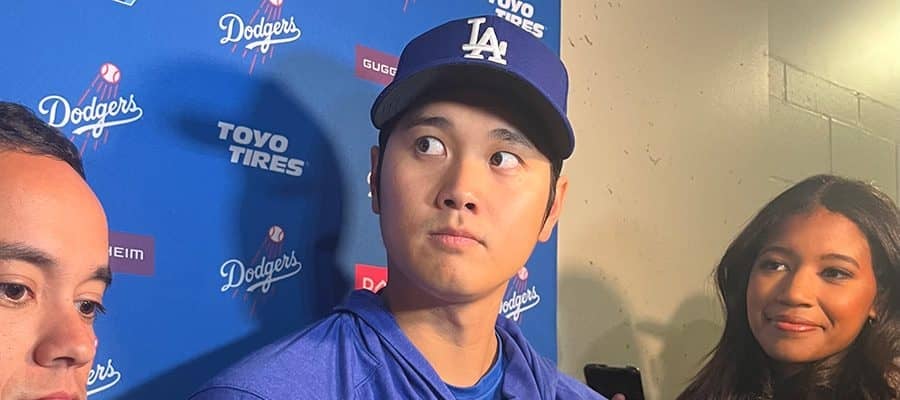 試合前に取材対応を行ったドジャース・大谷翔平【写真:小谷真弥】
