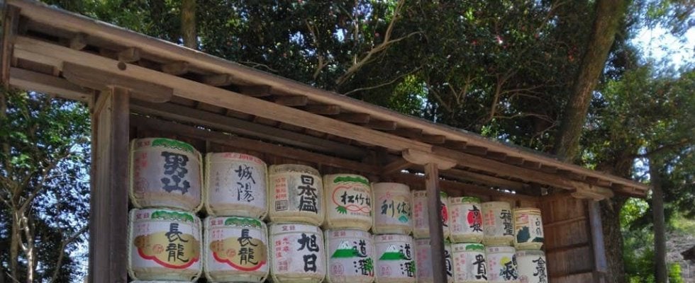 京都の石清水八幡宮に並ぶ菰樽。右下には近くの山崎蒸留所のウイスキー樽も! 提供/後藤健生