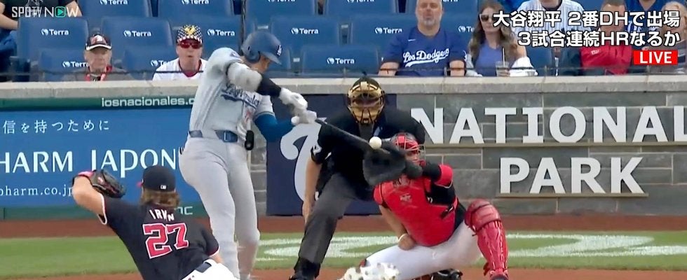 速すぎてカメラもまったく追いつけない打球だった。ドジャースの大谷翔平投手が「2番・DH」でスタメン出場。ナショナルズ戦の第1打席で打球速度186キロのツーベースを放った。高めの速球を弾き返すと、次の瞬間にはフェンス際まで転がっていた打球にファンからは驚きの声が続出した。