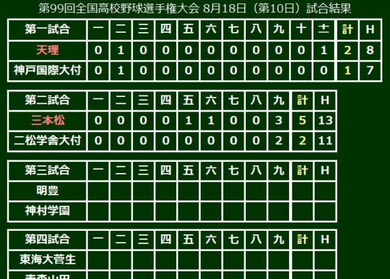 第99回全国高等学校野球選手権大会は18日、大会第10日が行われ、第2試合は三本松(香川)が二松学舎大付(東東京)を5-2で破り、初の準々決勝進出を決めた。エース佐藤が9回を87球で2失点完投と力投すると、打線も好投した二松学舎大付のエース左腕・市川から5点をもぎ取り、白星を飾った。