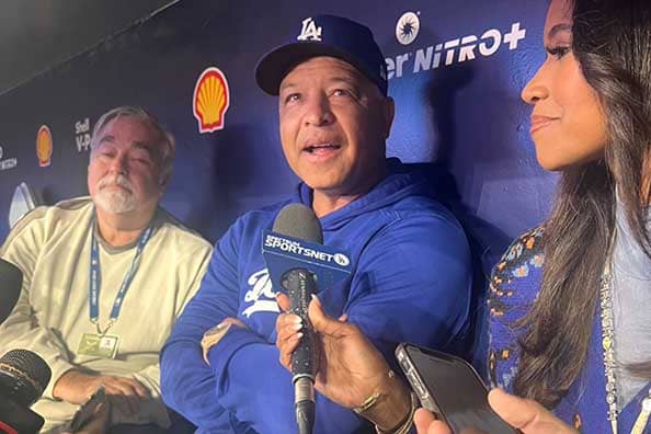 試合前に取材に応じるドジャースのデーブ・ロバーツ監督【写真:川村虎大】