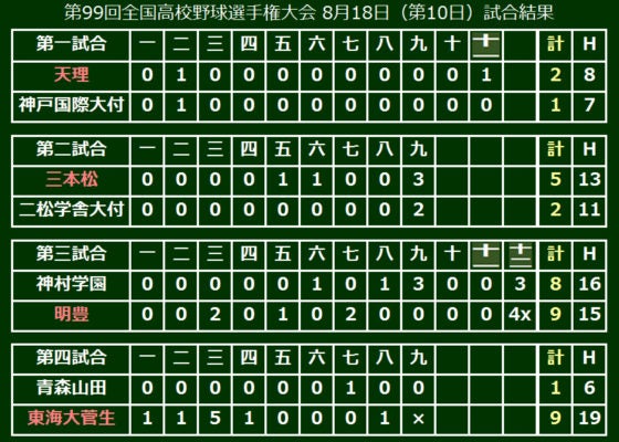 第99回全国高等学校野球選手権大会は18日、大会第10日が行われ、第3試合は明豊(大分)が神村学園(鹿児島)を延長12回の死闘の末に9-8で破り、8年ぶり3度目の準々決勝進出を決めた。3点リードの9回2死から同点に追いつかれ、延長12回に3点を勝ち越されたが、直後に打線がつながり一気に同点。最後は押し出し四球でサヨナラ勝ちという幕切れを迎えた。