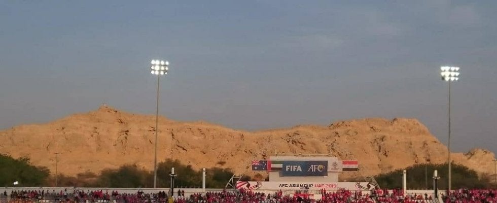 日本対ウズベキスタンの試合は、小さなハリード・ビン・ザイード・スタジアム(1万2000人収容)で行われました。バックスタンドの後方に岩山が見えるのが、なんともアル・アインらしい光景でした。そして、よく見ると、夕日に照らされたその岩山のてっぺんに1人の男性が座って、試合を観戦していたのです。