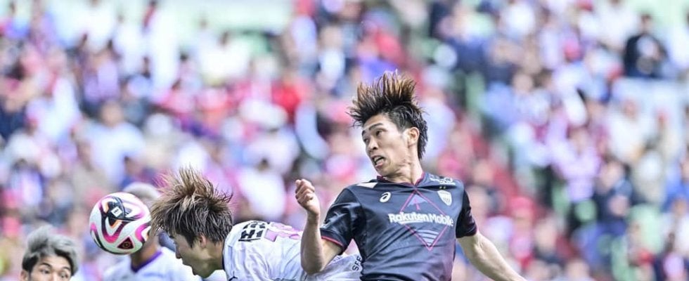 ヴィッセル神戸MF宮代大聖と京都サンガF.C.MF松田天馬の2人が競った場面。多くの意見が上がった。後方はボールを待つ大迫勇也 撮影:中地拓也