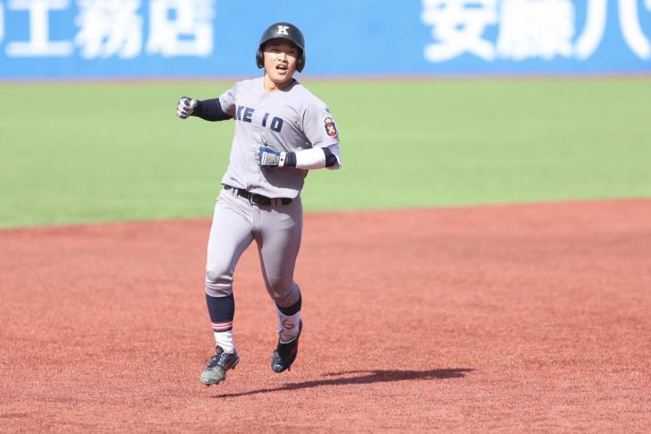 試合の中盤から終盤にかけては、代打策が的中していた。1-2とリードされて迎えた5回、先頭打者の代打に二宮慎太朗内野手(3年)を起用すると、プロ注目の法大先発左腕・吉鶴翔瑛投手(4年)から左翼席へ同点ソロ。二宮はリーグ戦初安打が起死回生の1発となった。