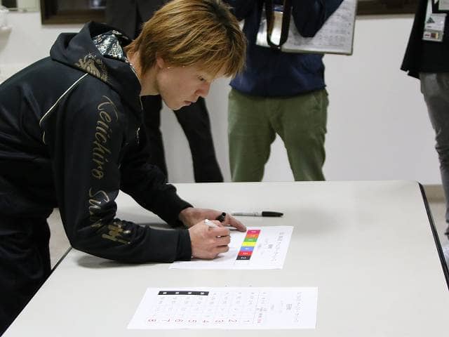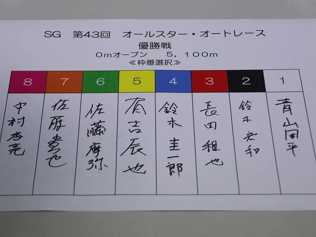 1番目の鈴木圭は4枠を選択。次の青山から有吉までは空いているうちから順に枠が埋まっていったが、6番目の中村は大外を選択し、佐藤摩が6枠、最後の佐藤貴が7枠で決定した。
