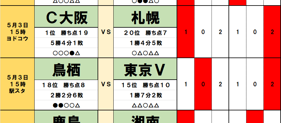 今回のtotoは、J1第11節の10試合とJ2第13節の3試合が対象となっている。過去のデータや直近のチーム状況などか…