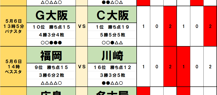 今回のtotoはJ1第12節の10試合とJ2第14節の3試合が対象となっている。過去のデータや直近の様子などから、分析…