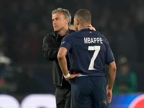 ドルトムントに敗れ、キリアン・エムバペをなぐさめるルイス・エンリケ監督(パリ・サンジェルマン)photo by AP/AFLO