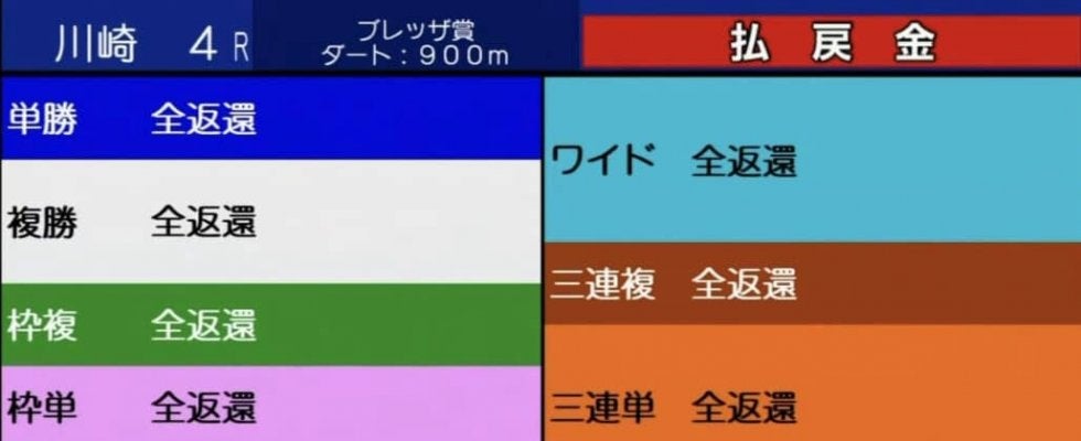 第4Rでは、大外の馬を誘導する係員がゲートを出る前にスタートが切られて危ない場面があり、真正なスタートではないと判断されてカンパイをアピール。しかし、コース上の係員も早々に退いてしまい、全頭がゴール板を駆け抜けてしまった。その後は全頭競走除外となり、競走の取り止めが決まった。