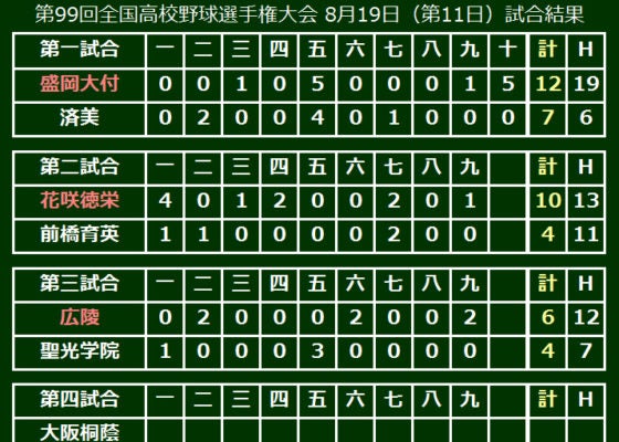 第99回全国高等学校野球選手権大会は19日、大会第11日が行われ、第3試合は接戦の末、広陵(広島)が聖光学院(福島)を6-4で破り、10年ぶりベスト8進出を決めた。