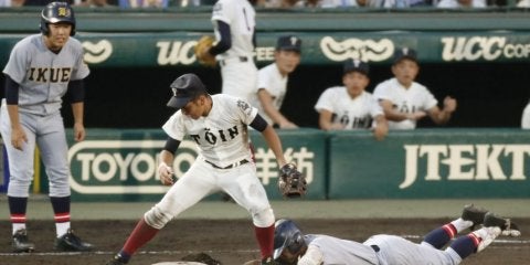 大阪桐蔭-仙台育英 9回裏仙台育英2死一、二塁、若山(右)の遊ゴロで、一塁手中川がベースを踏めずセーフとなる=甲子園【写…